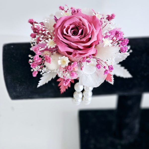 Corsaj mediu realizat din flori uscate si criogenate pe bratara cu perle, ce contine un trandafir de 3 cm. Culori predominante roz-spuma-vin, mov-lavanda, roz-baby, alb si ivoire.
