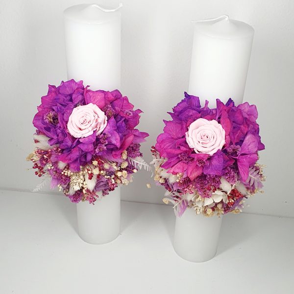 Set de lumanari personalizate si decorate cu flori criogenate, ce contin cate un trandafir de 7 cm diametru, hortensie, lavanda si floarea-miresei criogenata. Culori predominante mov, indigo, lila si alb.