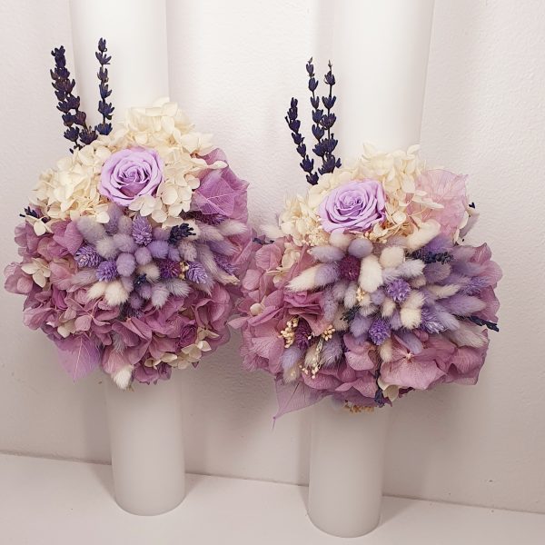 Lumanari pentru nunta personalizate realizate din flori uscate si criogenate, ce contin 3 trandafiri criogenati de diferite marimi si lavanda criogenata. Culori predominante mov lavanda, lila si ivoire. Lungimea lumanarilor este de 40 cm.