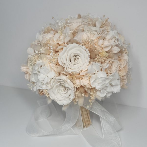 Buchet realizat cu flori uscate si criogenate, ce contine 11 trandafiri de diferite dimensiuni si soiuri, hortensie criogenata, statica criogenata si hortensie criogenata. Culori predominante crem, ivoire si alb.
