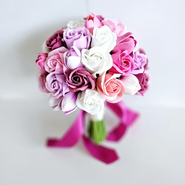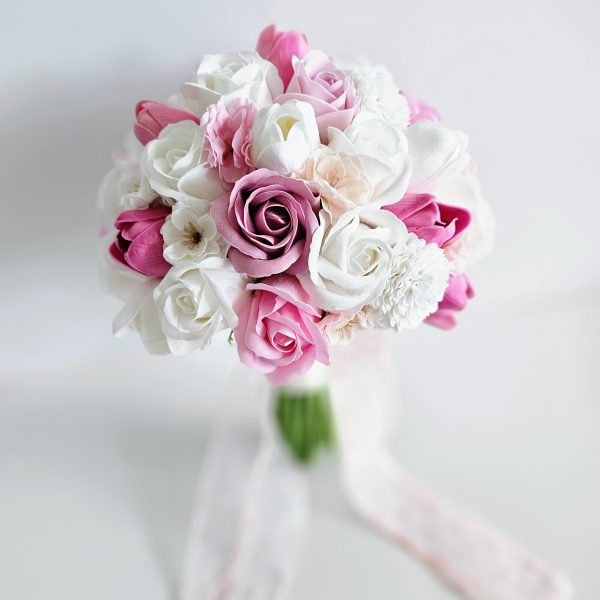 Buchet realizat cu flori de sapun, ce contine aproximativ 30 de trandafiri de sapun. Culori predominante alb, roz-intens, roz-pudra si roz-pal.