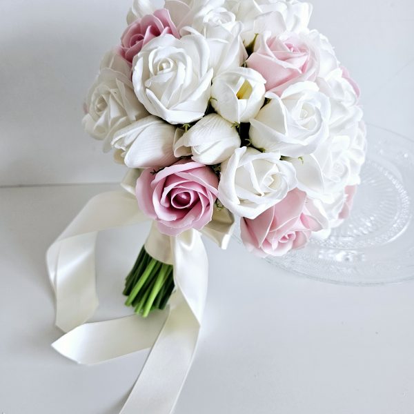 Buchet realizat din flori de sapun, ce contine aproximativ 30 de trandafiri de sapun. Culori predominante alb si roz-prafuit.