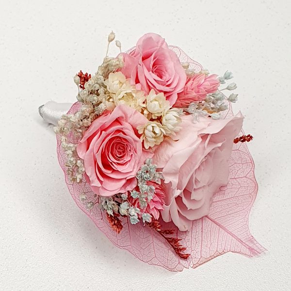Cocarda mediu plus realizata din flori uscate si criogenate ce contine trei trandafiri de diferite dimensiuni. Culori predominante roz pal, bleo si ivoire.