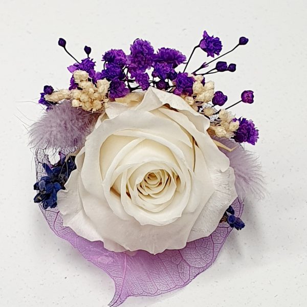 Cocarda realizata din flori uscate si criogenate ce contine trei trandafiri de diferite dimensiuni. Culori predominante lila, mov, alb si ivoire.