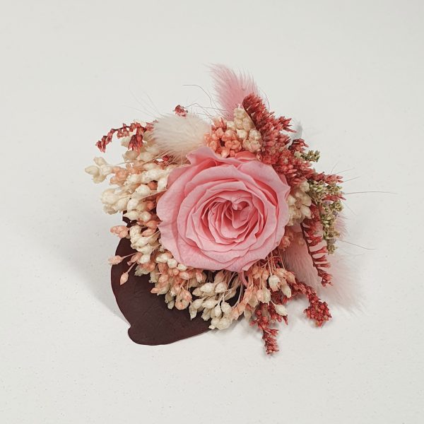 Cocarda realizata din flori uscate si criogenate. Contine un trandafir de 1 cm. Culori predominante roz si ivoire. Produsul se realizeaza doar pe comanda si pe orice cromatica.