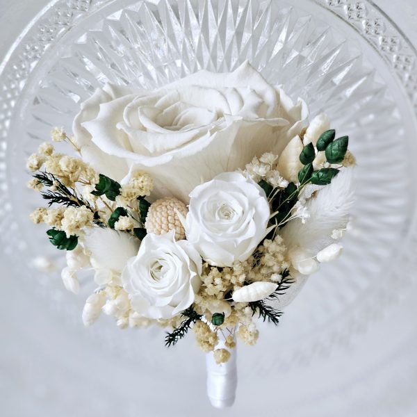 Cocarda medie realizata din flori uscate si criogenate ce contine un trandafir de 3 cm. Culori predominante verde-siberian si ivoire. Produsul se realizeaza doar pe comanda si in limita stocului disponibil de flori.