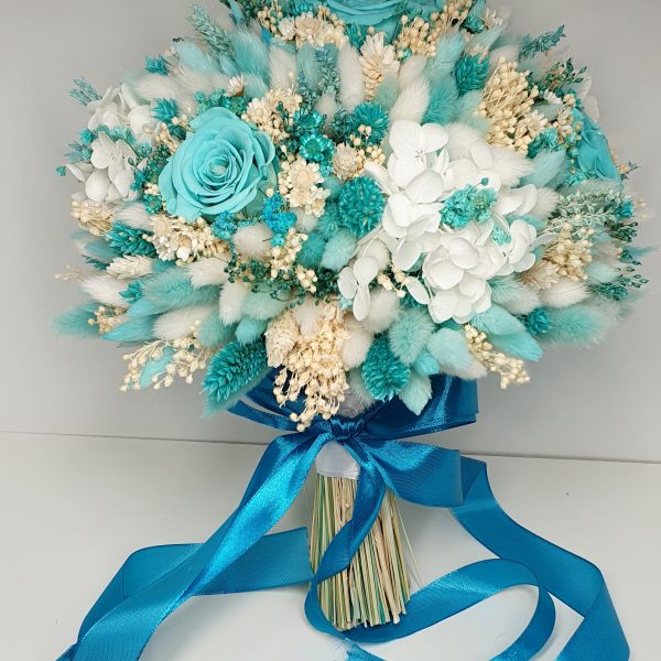 Buchet realizat din flori uscate si criogenate ce contine 5 trandafiri si hortensie criogenata. Culori predominante turquoise, alb si ivoire.