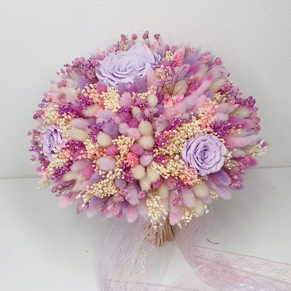 Buchet realizat din flori uscate si criogenate ce contine 5 trandafiri si floarea-miresei criogenata. Culori predominante roz-pal, mov-lila, violet si ivoire.