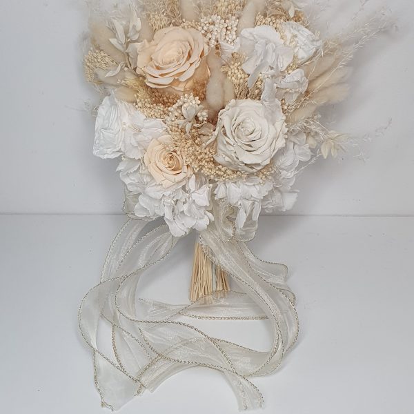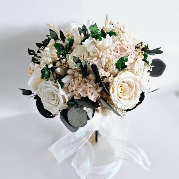 Buchet realizat din flori uscate si criogenate, ce contine 9 trandafiri criogenati de diferite dimensiuni, hortensie, floarea-miresei, hortensie criogenata si alte plante. Culori predominante crem, bej, ivoire, alb si verde.
