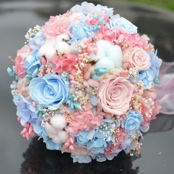 Buchet realizat din flori uscate si criogenate ce contine 15 trandafiri de diferite marimi, hortensie, floarea-miresei, craspedia si alte flori criogenate. Culori predominante roz-baby, roz-pal, bleu-ciel, ivoire si alb.