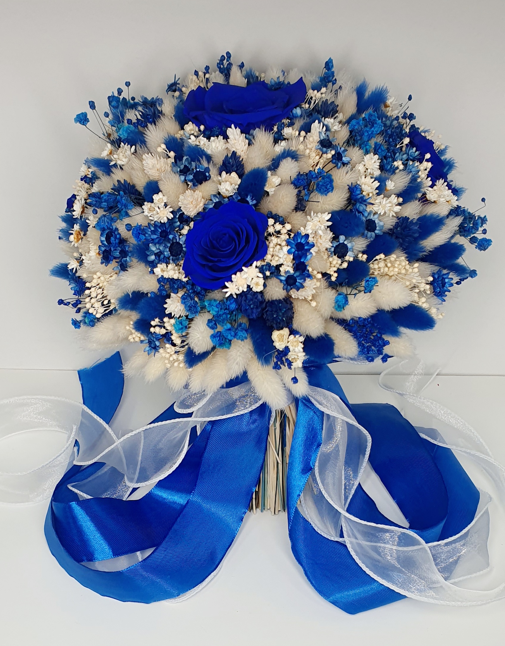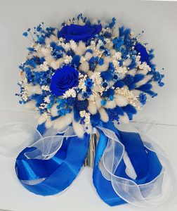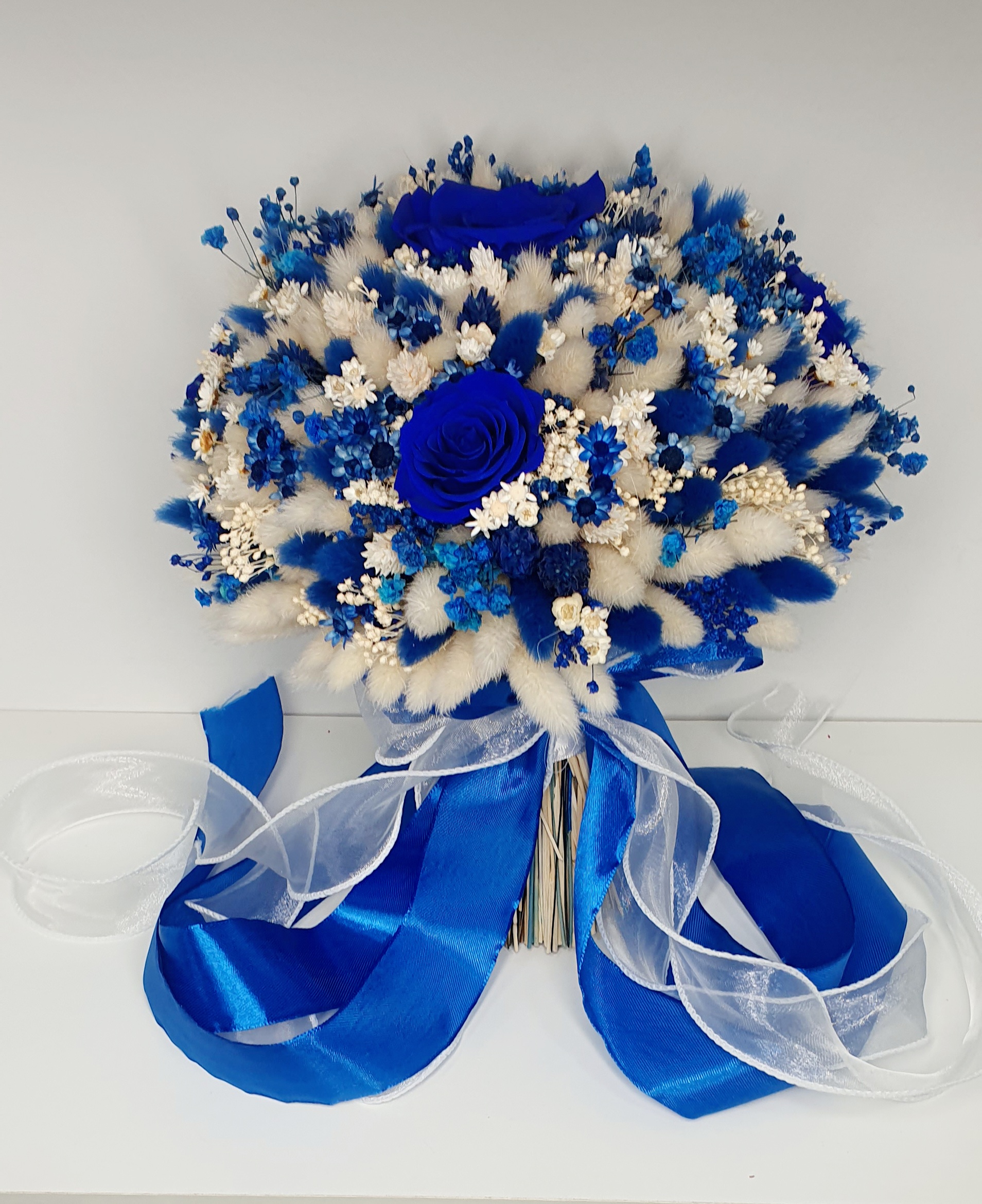 Buchet realizat din flori uscate si criogenate ce contine 5 trandafiri criogenati de diferite marimi. Culori predominante albastru si ivoire.