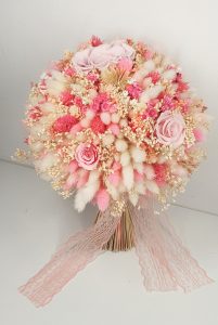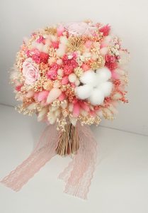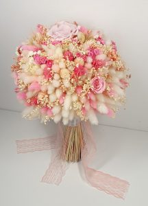 Cryogenically dried flower bouquet containing 15 cryogenically dried roses, hydrangea, bridal flowers and other cryogenically dried flowers. Predominant colours: dusty-pink, dark-pink, wine-foam-pink, pale-pink and white.
