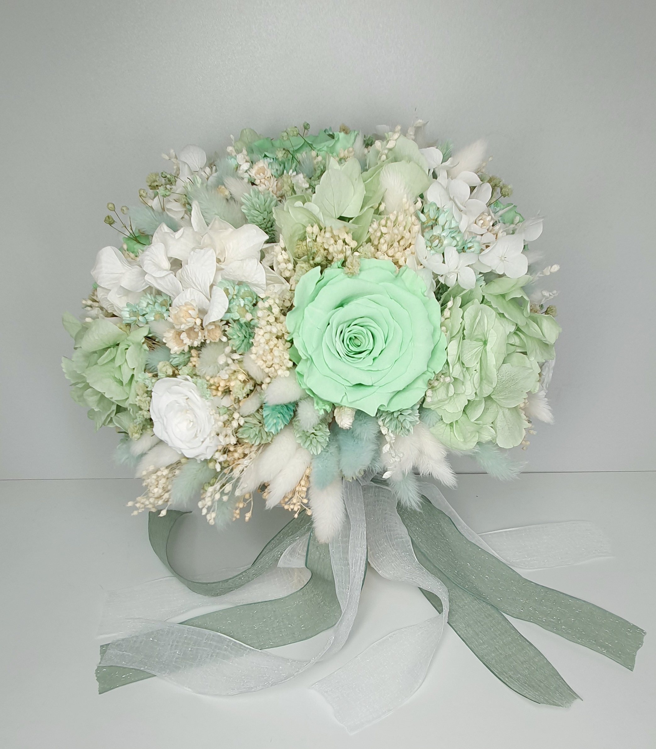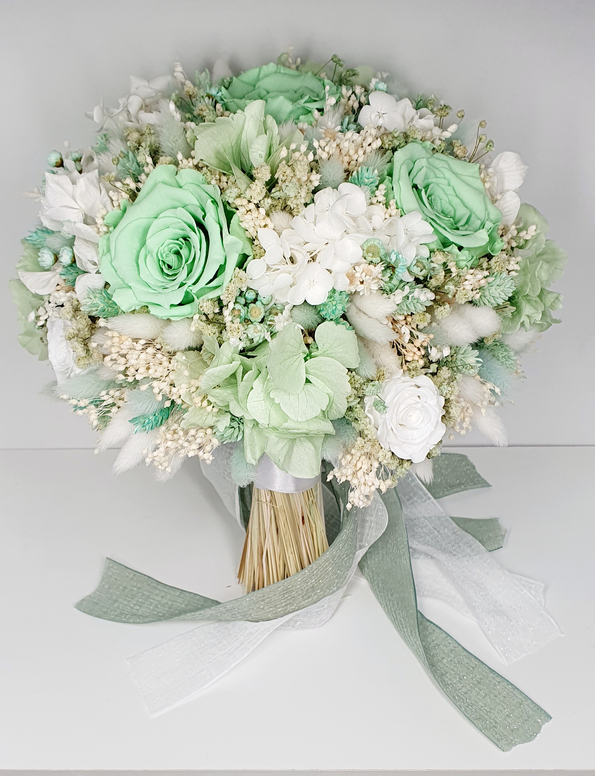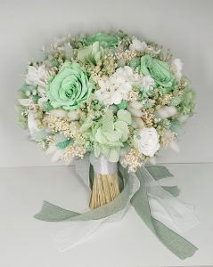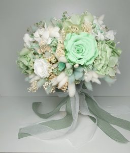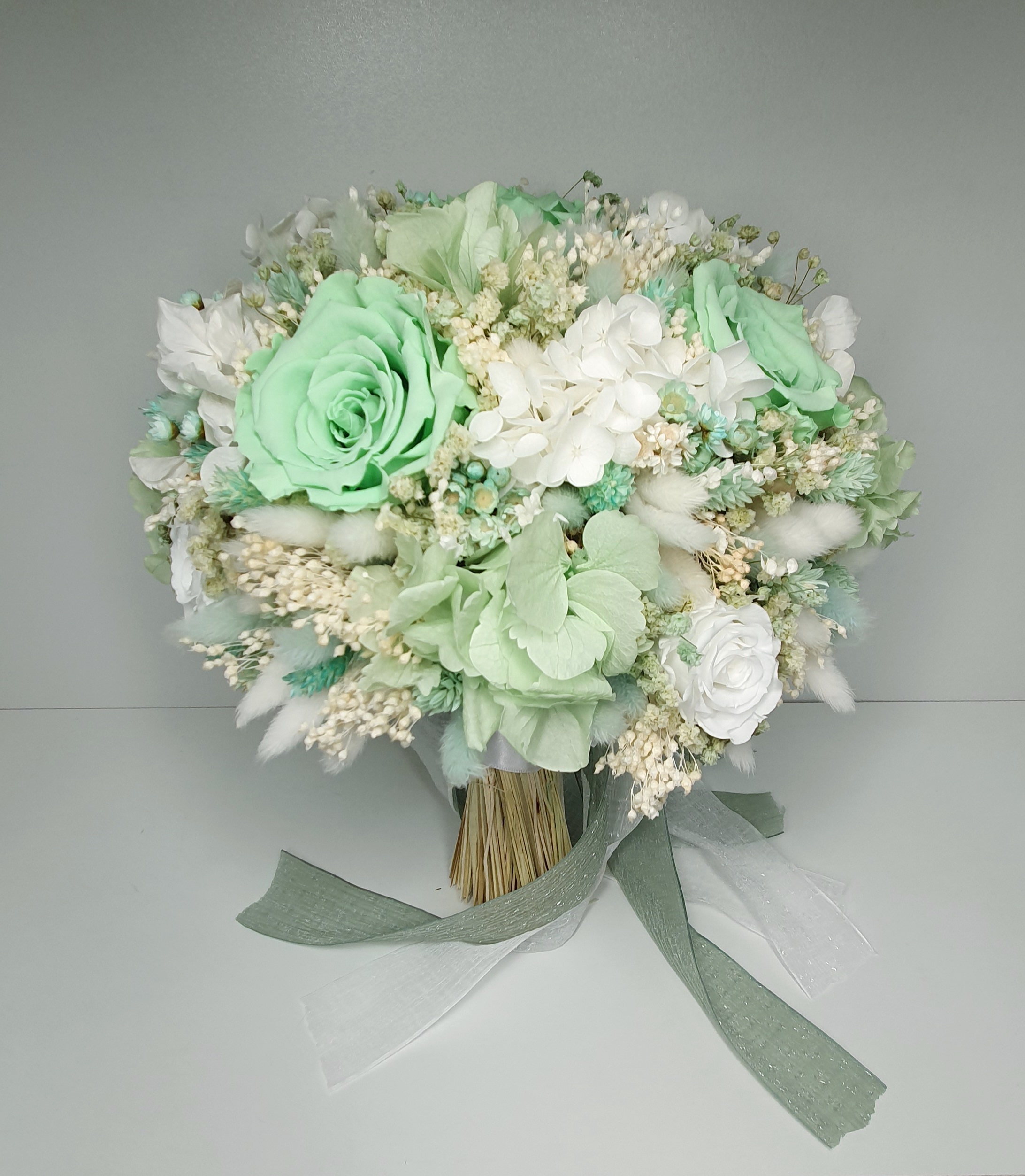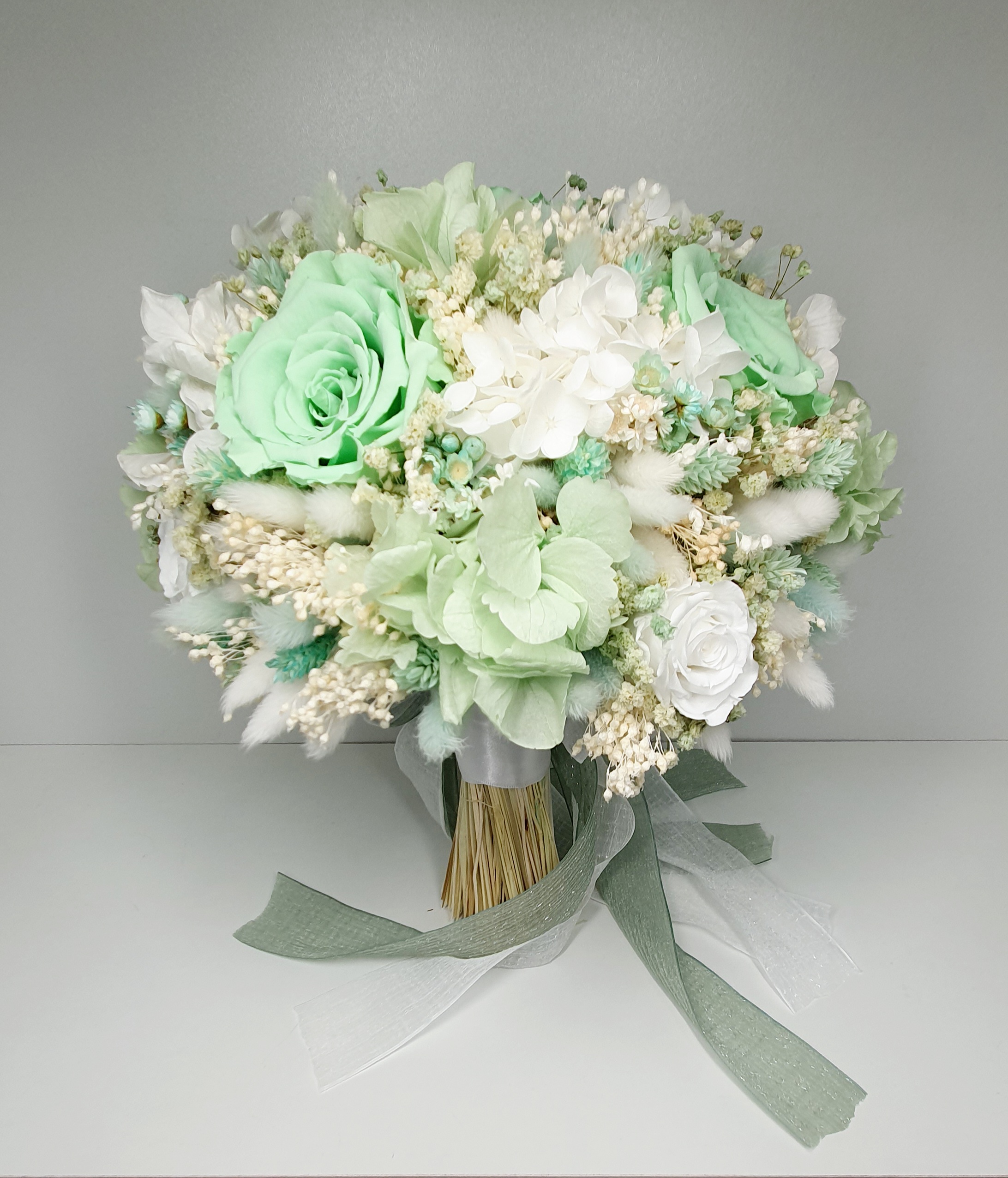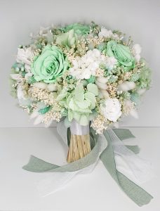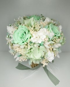 Buchet realizat din flori uscate si criogenate. Contine 5 trandafiri si hortensie criogenata. Culori predominante vernil, alb si ivoire.