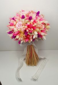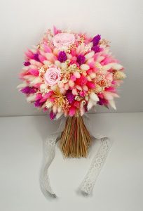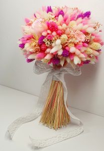 Buchet realizat din flori uscate si criogenate ce contine 5 trandafiri criogenati de diferite marimi. Culori predominante roz, mov, ivoire.