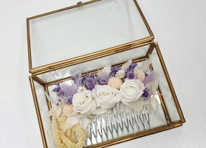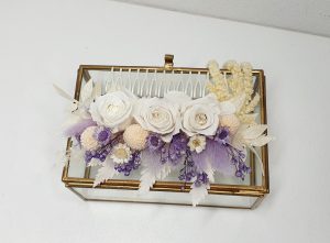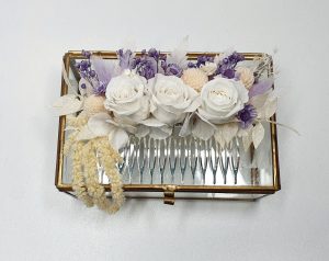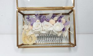 Cocarda realizata cu flori uscate si criogenate ce contine trei trandafiri criogenati, hortensie si floarea miresei criogenata. Culori predominante mov-lila, alb-imaculat si ivoire.