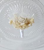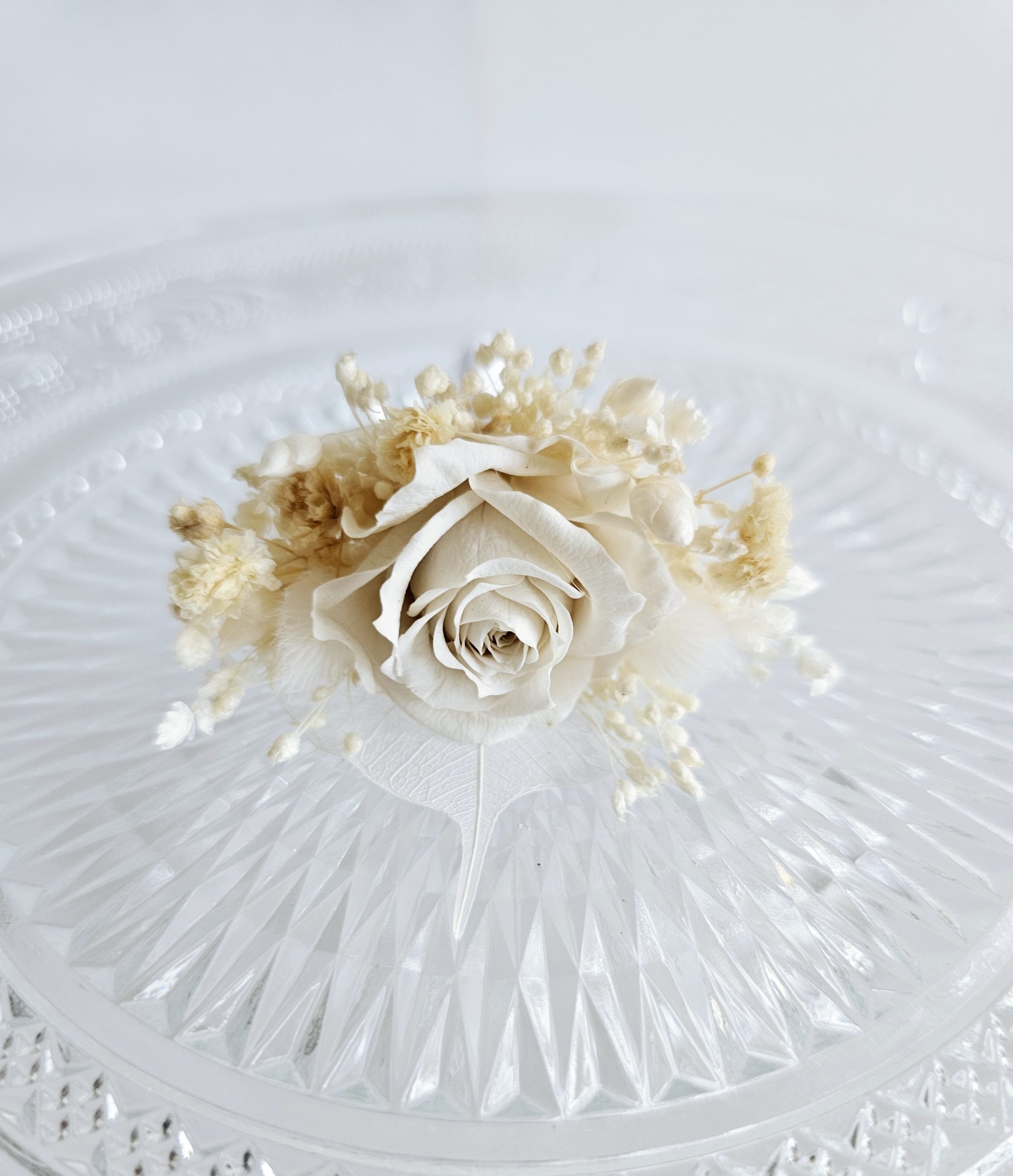 Cocarda mica plus realizata din flori criogenate si uscate, ce contine un trandafir de 2 cm, floarea miresei si alte flori criogenate. Culori predominante alb, crem si ivoire.