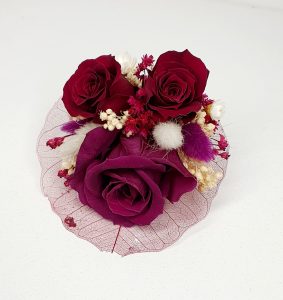 Cocarda mediu plus realizata cu flori uscate si ciorgenate, ce cntine trei trandafiri de diferite dimensiuni. Culori predominante mov-pruna, rosu-bordeaux si ivoire.