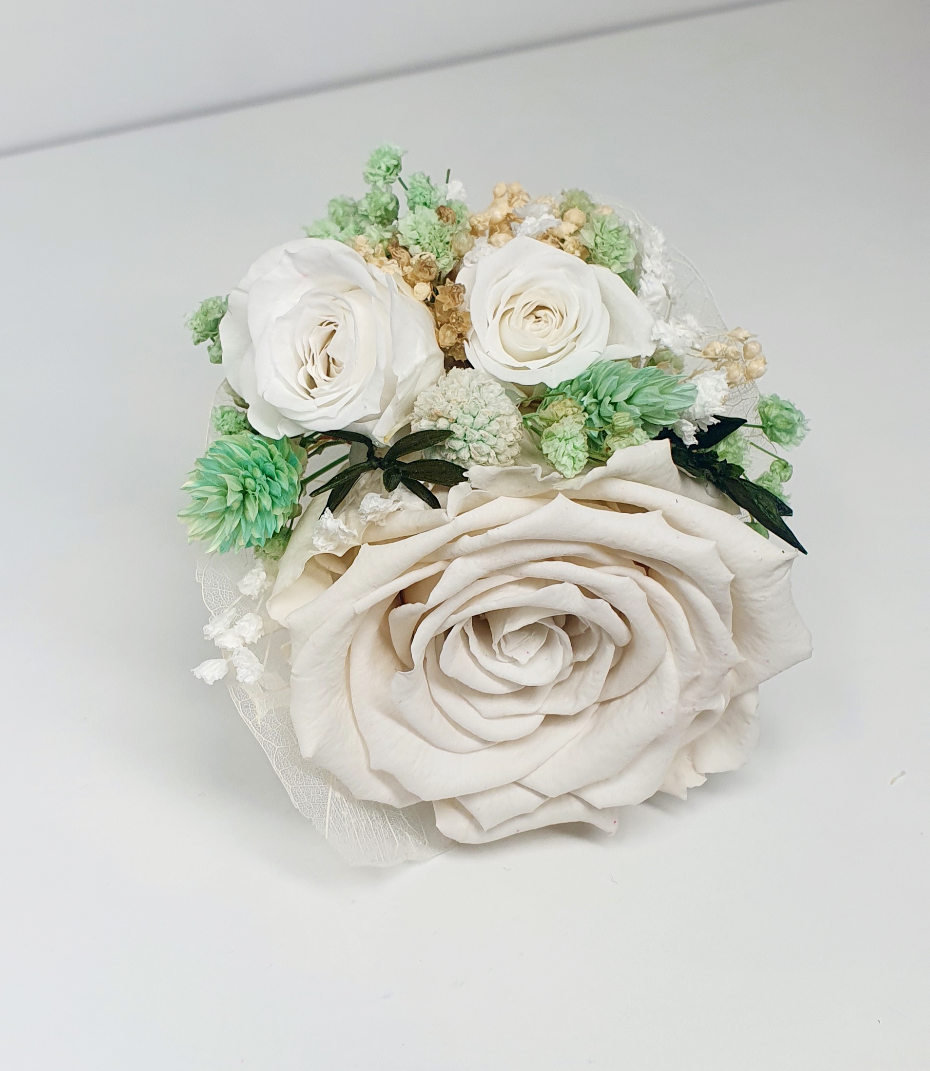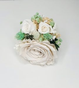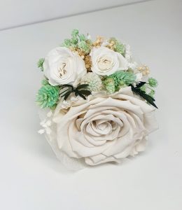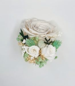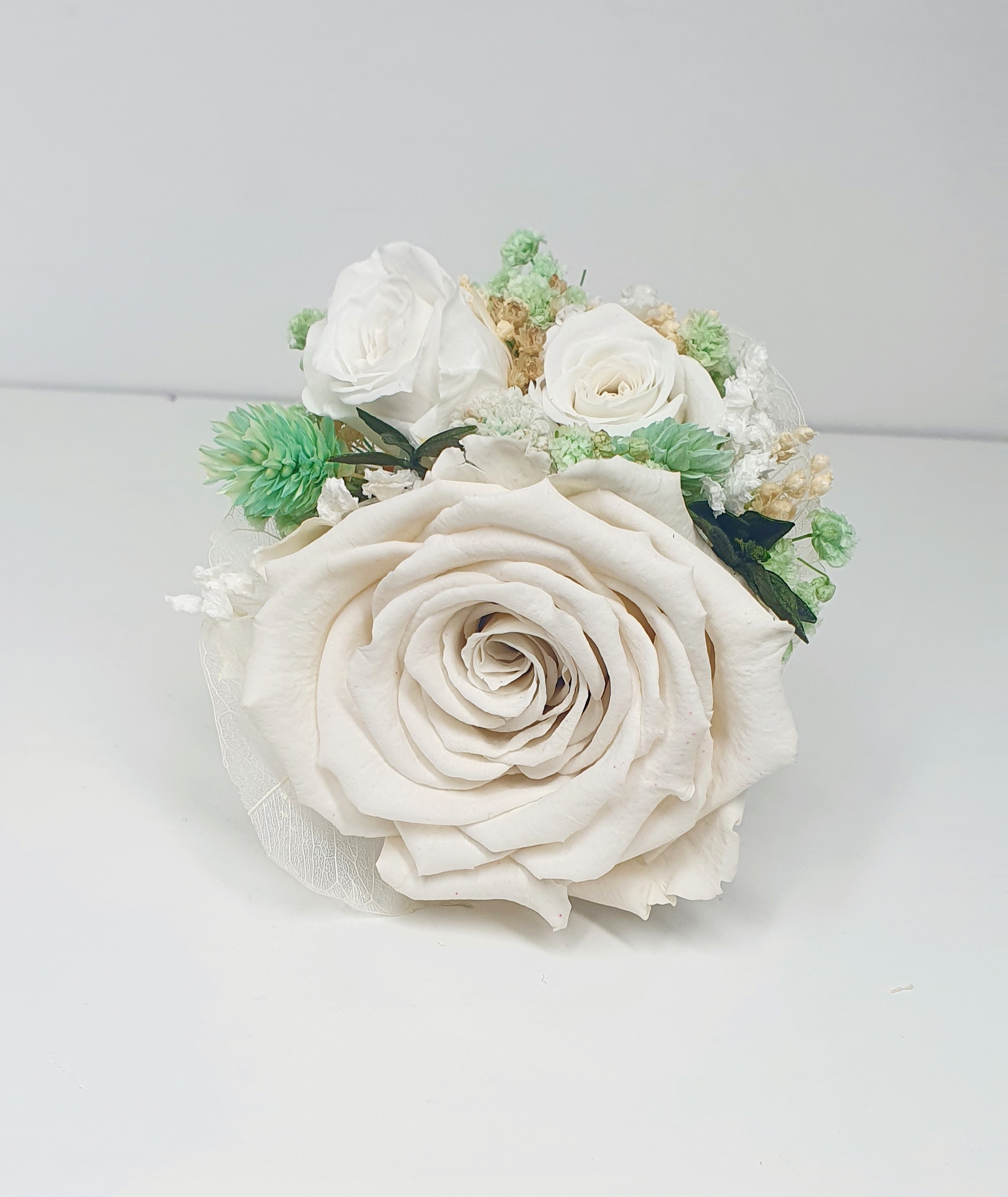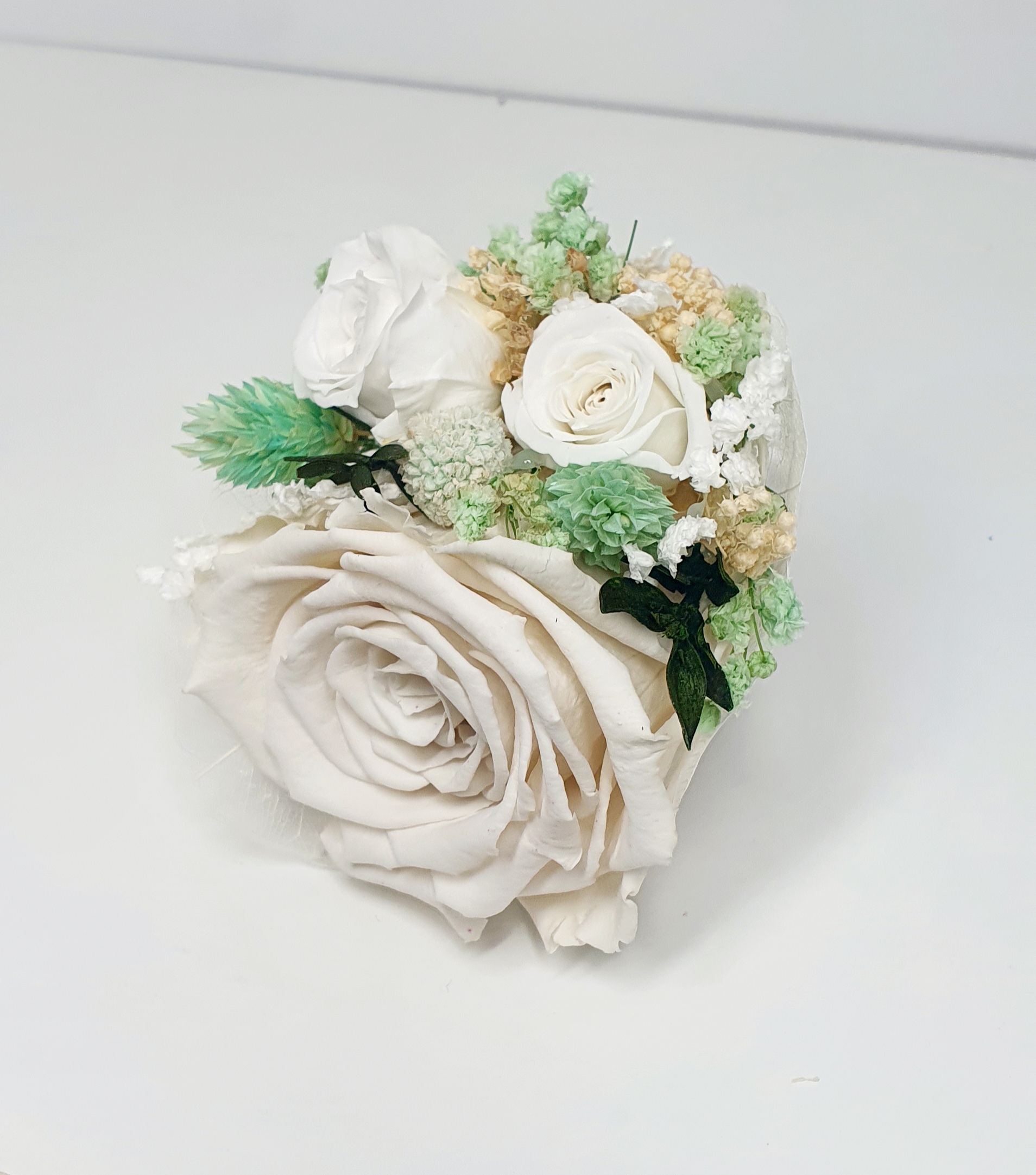 Cocarda mare realizata din flori uscate si criogenate ce contine un trandafir de 5 cm si doi trandafiri de 1 cm. Culori predominante vernil, alb-imaculat, verde-inchis si ivoire.