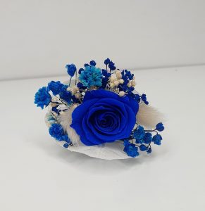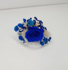 Cocarda mica realizata din flori uscate si criogenate. Contine un trandafir de 1 cm. Culori predominante albastru royal si ivoire.