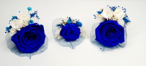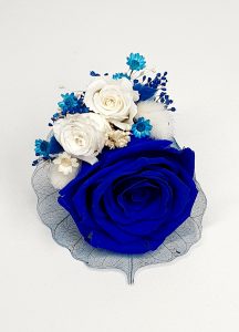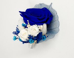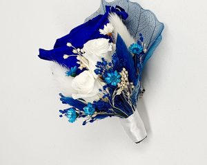 Cocarda mare realizata din flori uscate si criogenate ce contine trei trandafiri de diferite marimi. Culori predominante albastru-royal si alb.