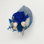 Cocarda medie realizata din flori uscate si criogenate ce contine un trandafir de 3 cm. Culori predominante albastru-royal, bleo, alb si ivoire.