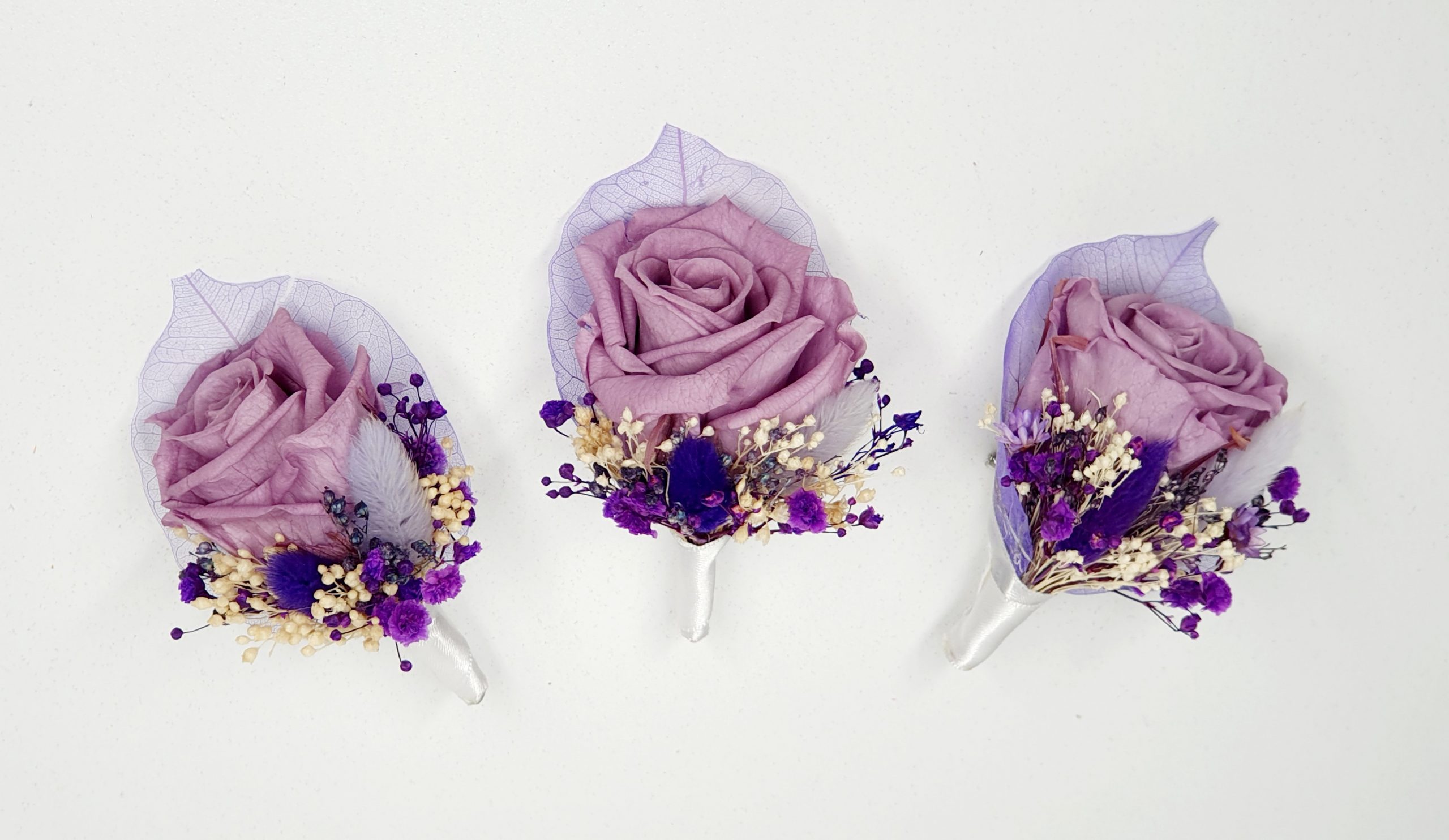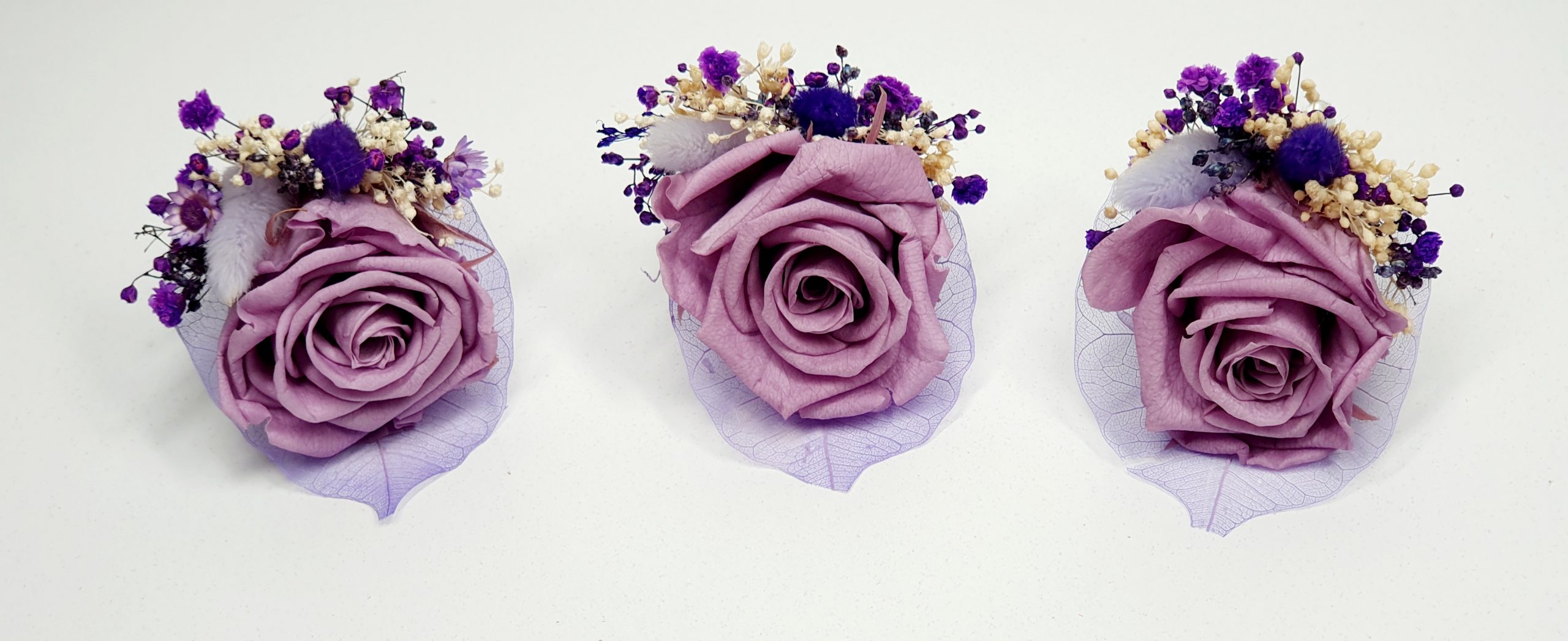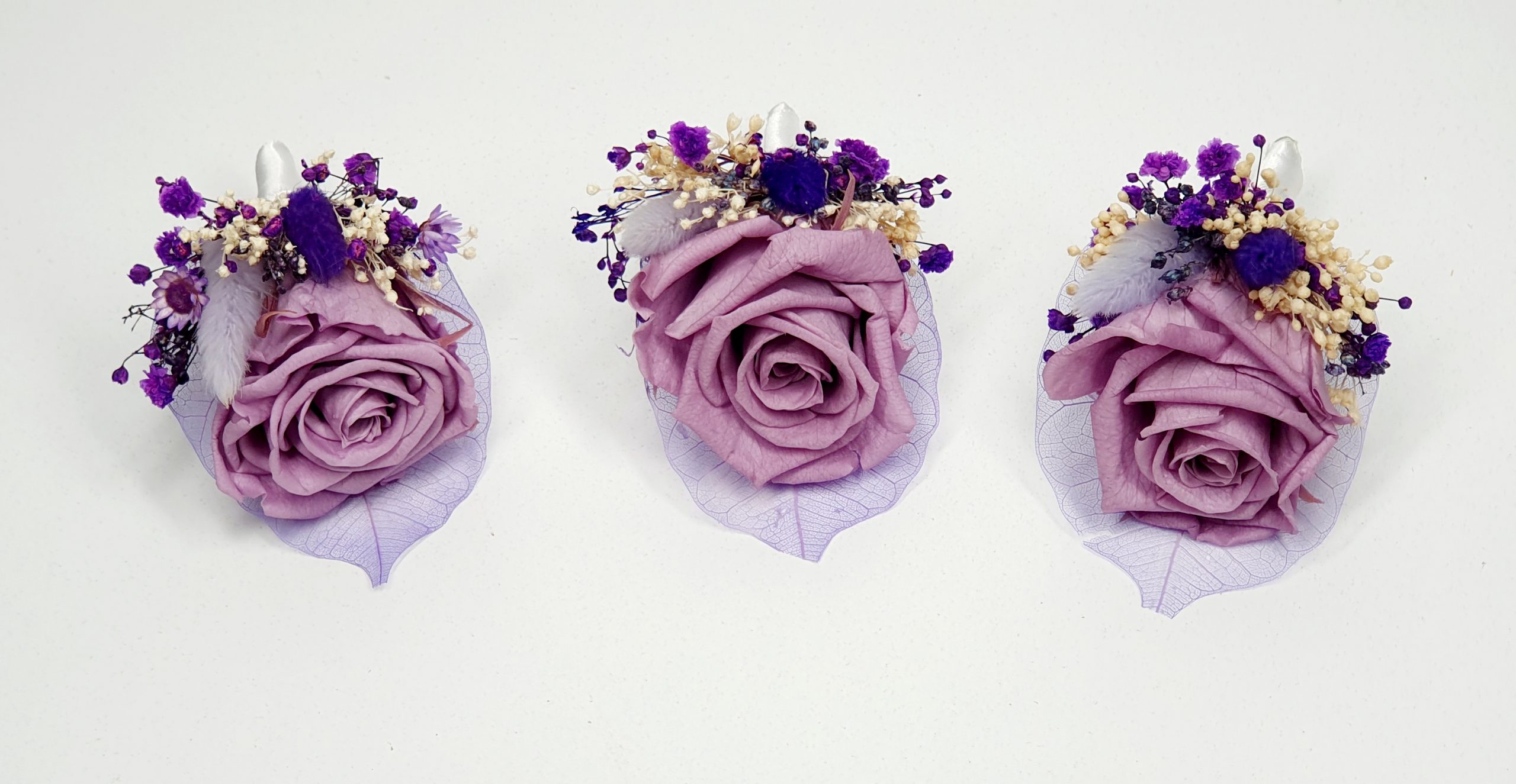Cocarda medie realizata din flori uscate si criogenate, ce contine un trandafir de 4 cm. Culori predominante mov, mov-indigo si ivoire.