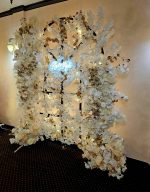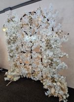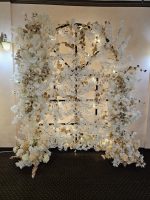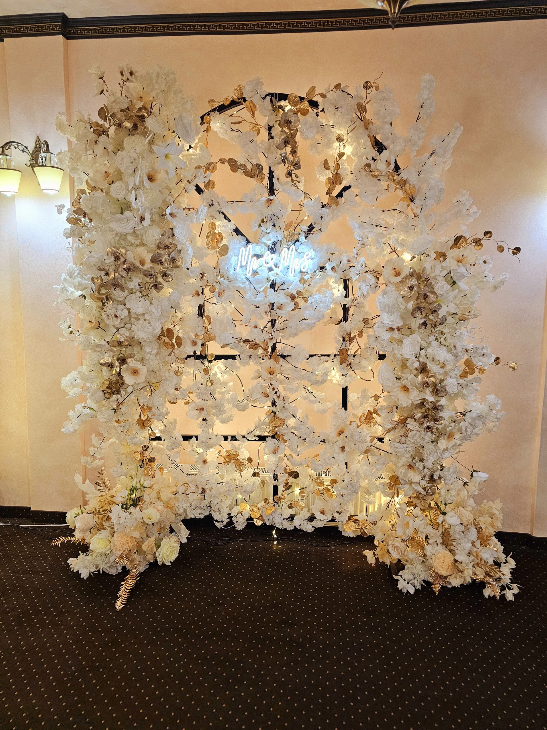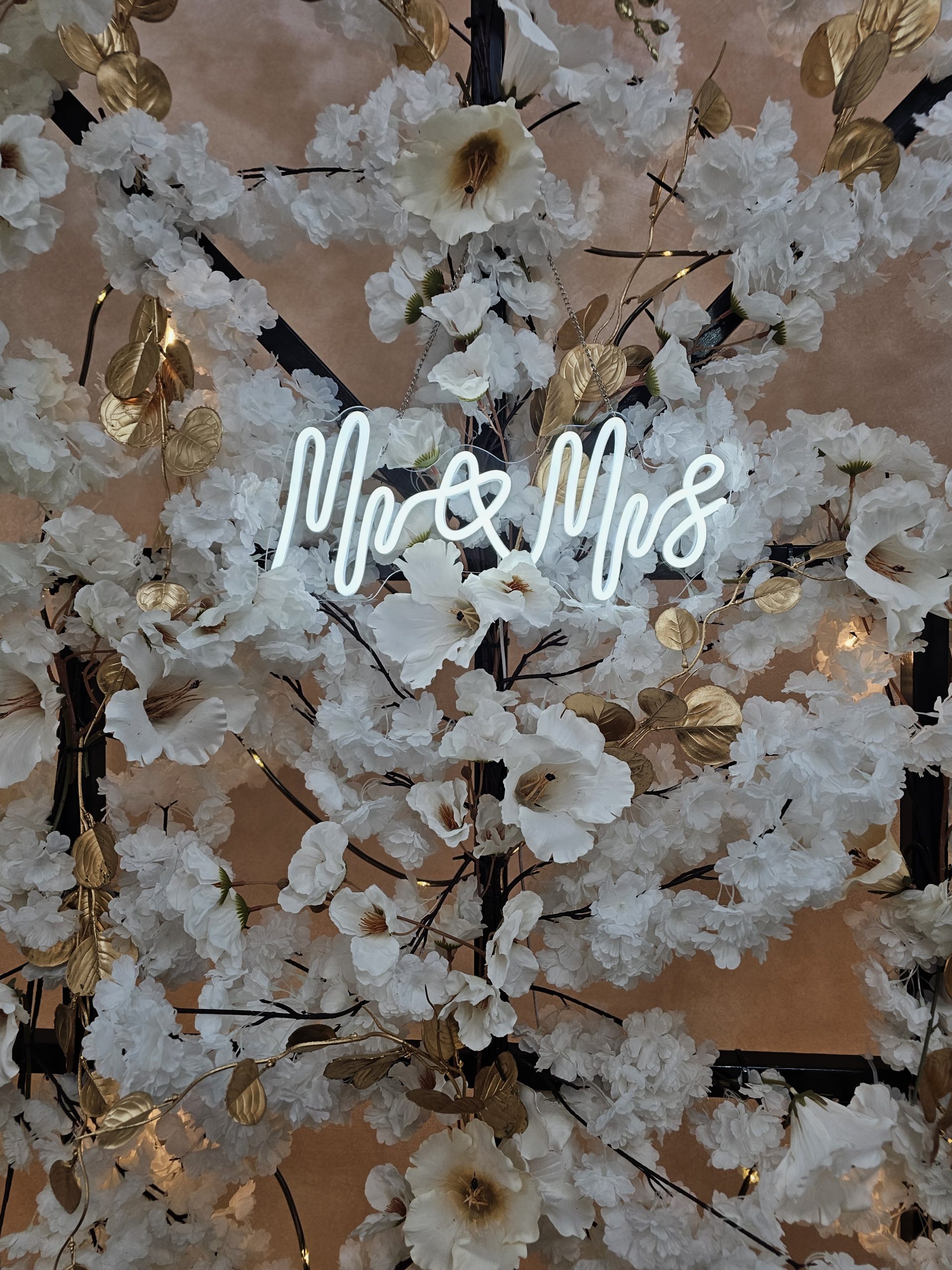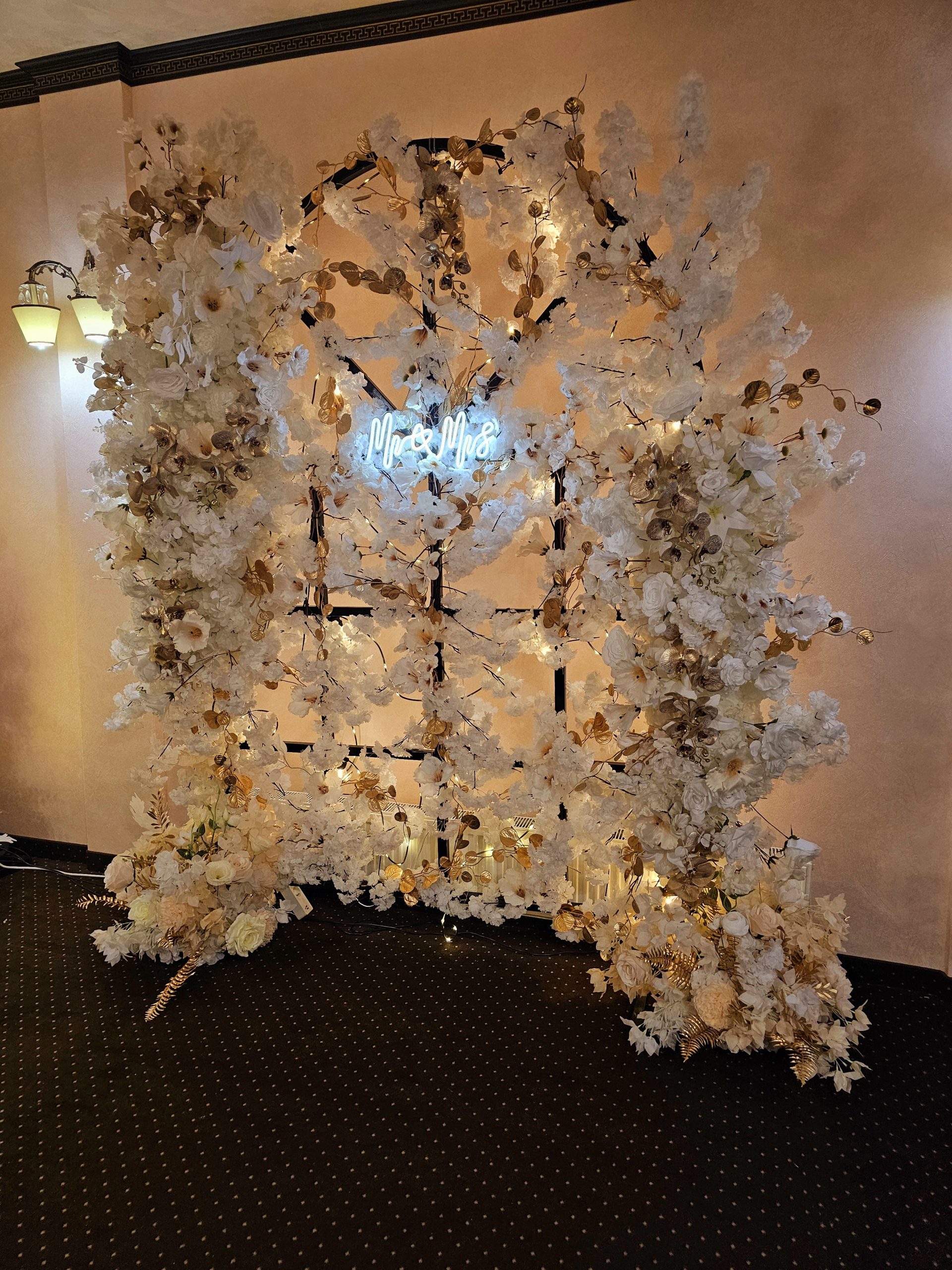 Panou PhotoCorner tip Fereastra, decorata cu flori artificiale, ce contine si un semn luminos LED “Mr & Mrs”. Culori predominante alb, ivoire si auriu.