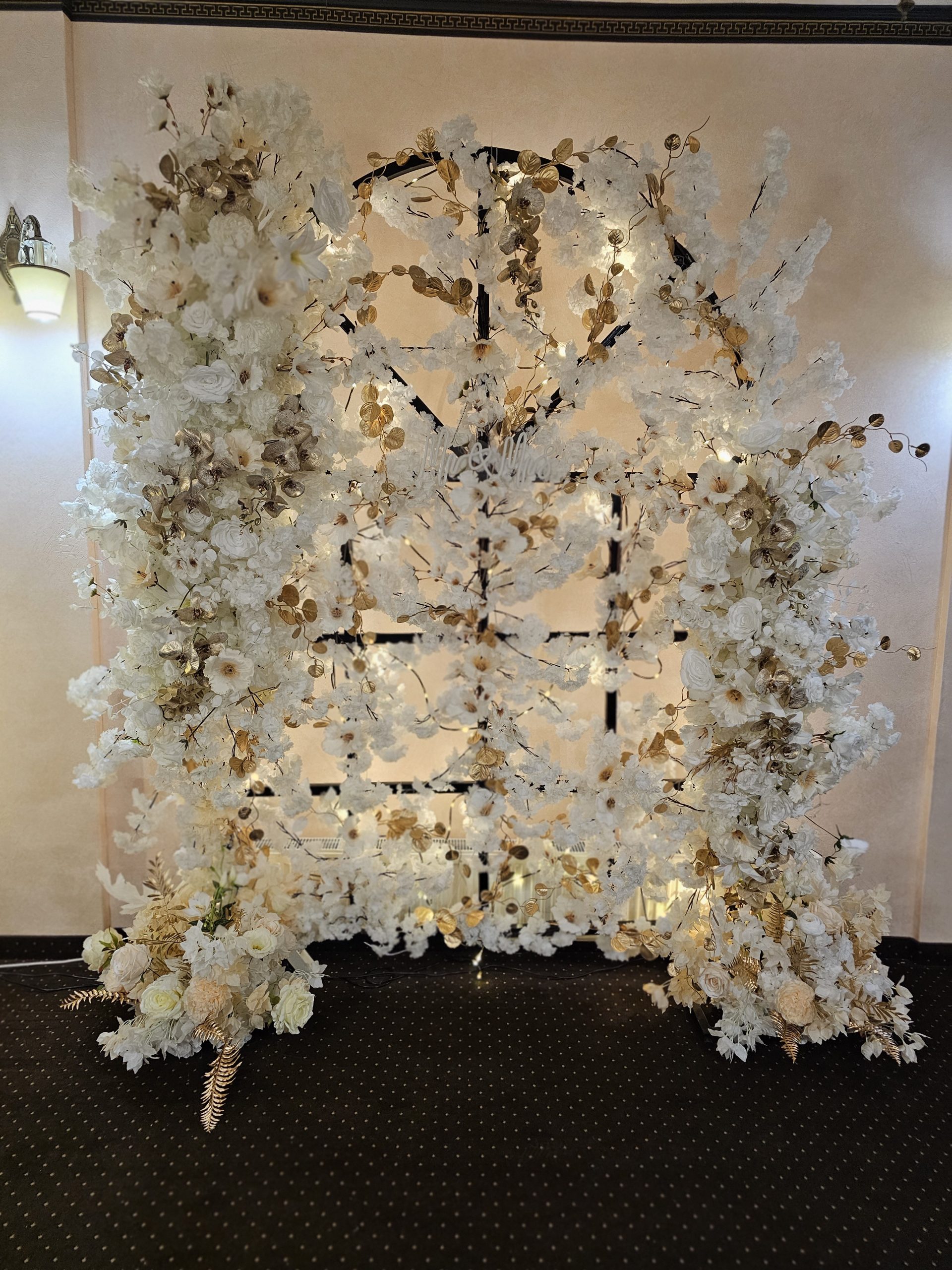Wooden arch decorated with artificial flowers + arrangement for the presidium table made of artificial flowers. Predominant colors white and green.