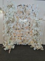 Decor pentru masa de prezidiu, realizat din flori artificiale. Culori predominante alb si verde.