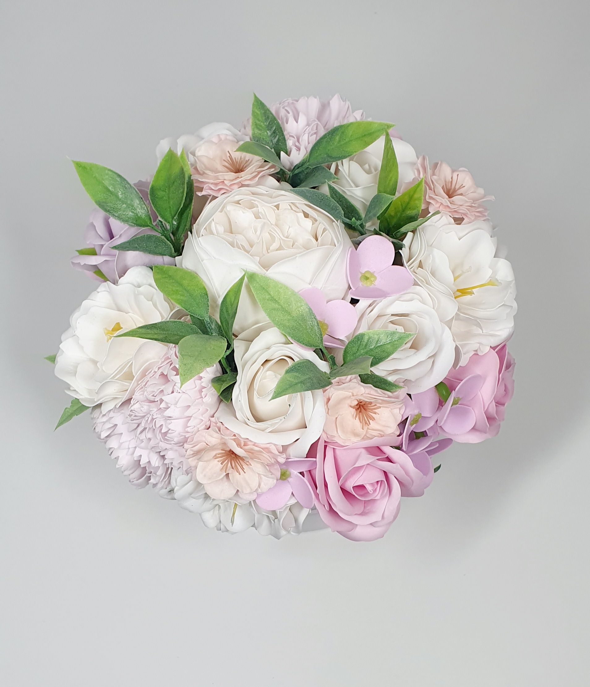 Aranjament floral realizat cu flori de sapun, ce contine aproximativ 17 trandafiri de sapun si flori artificiale. Culori predominante roz-pal, lila si alb.