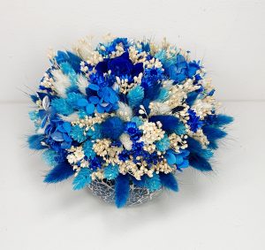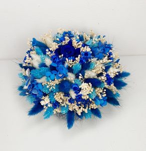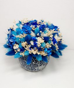 Aranjament floral realizat cu flori uscate si criogenate, ce contine un trandafir de 3 cm si hortensie criogenata. Culori predominante albastru-royal, bleo si ivoire.