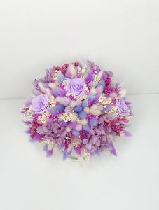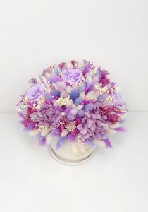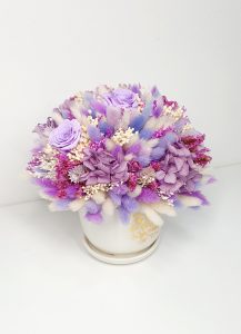Aranjament floral realizat cu flori uscate si criogenate in vaza de ceramica, ce contine trandafiri si hortensie criogenate. Culori predominante lila, mov, mov-lavanda, ivoire si alb.