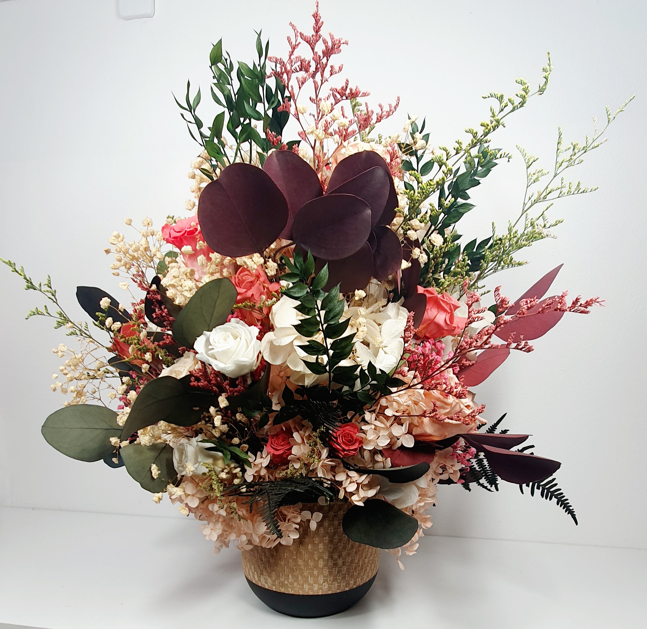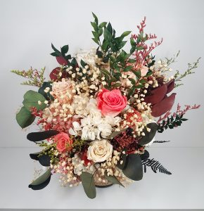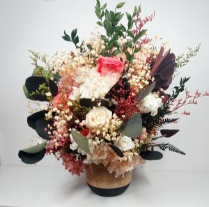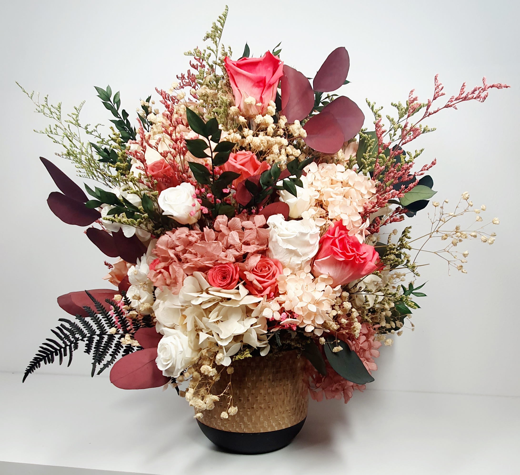 Aranjament realizat cu flori criogenate in vaza de ceramica. Contine 31 de trandafiri criogenati de diferite marimi. Culori predominante roz pudra, piersica si ivoire.
