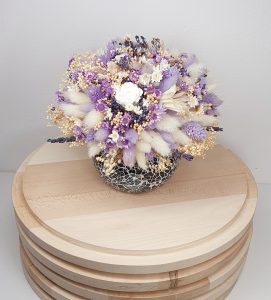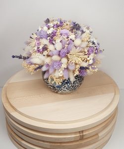 Aranjamanet realizat din flori uscate si criogenate in vaza de ceramica ce contine 3 trandafiri criogenati. Culori prdominante lila, mov si ivoire.