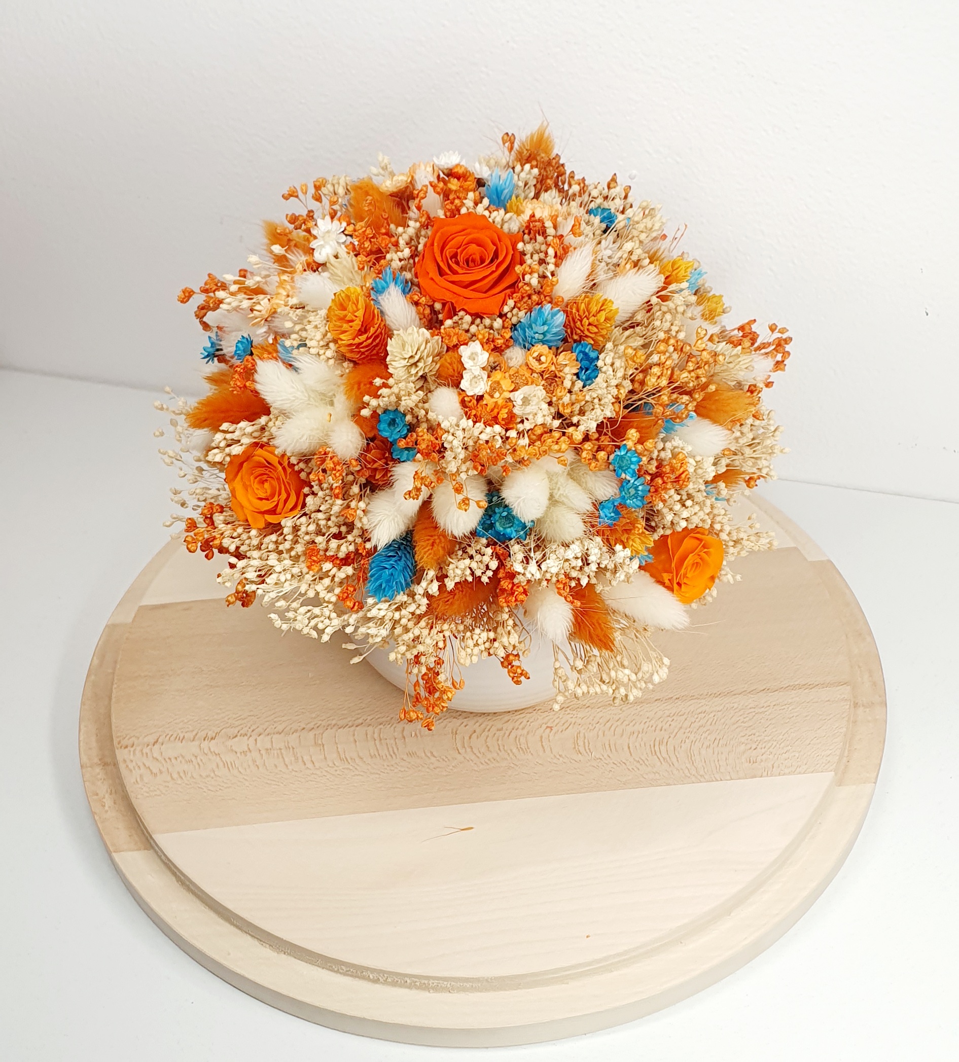 Aranjamanet realizat din flori uscate si criogenate in vaza de ceramica ce contine 3 trandafiri criogenati. Culori prdominante portocaliu, albastru-deschis si ivoire.