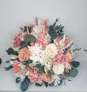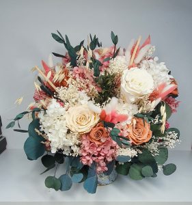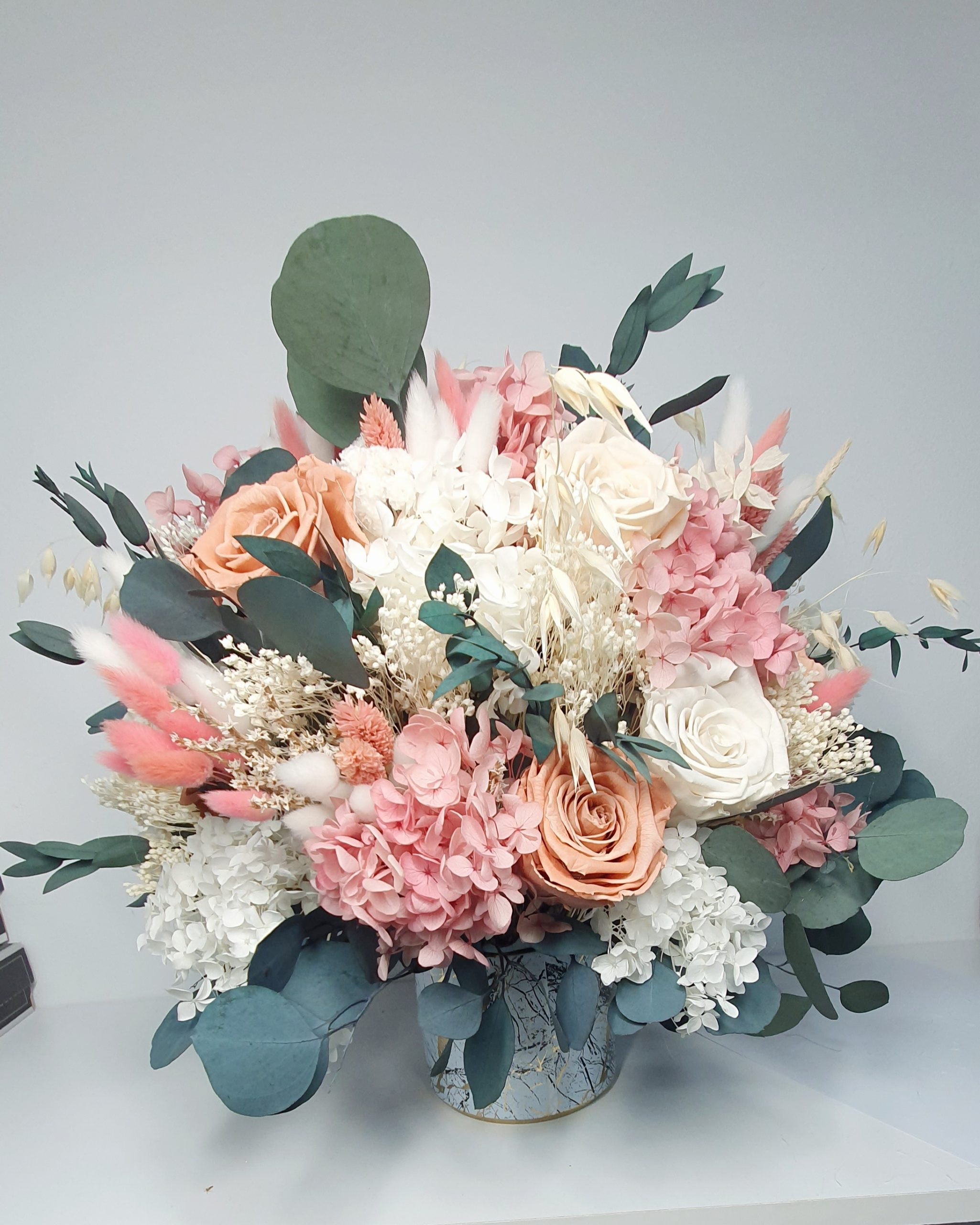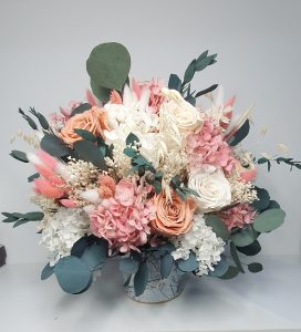 Aranjament floral realizat cu flori criogenate si uscate, ce contine 27 de trandafiri, hortensie, floarea-miresei, eucalipt criogenat. Culori predominante roz-pal, roz-pudra, roz-somon, verde, ivoire si alb.