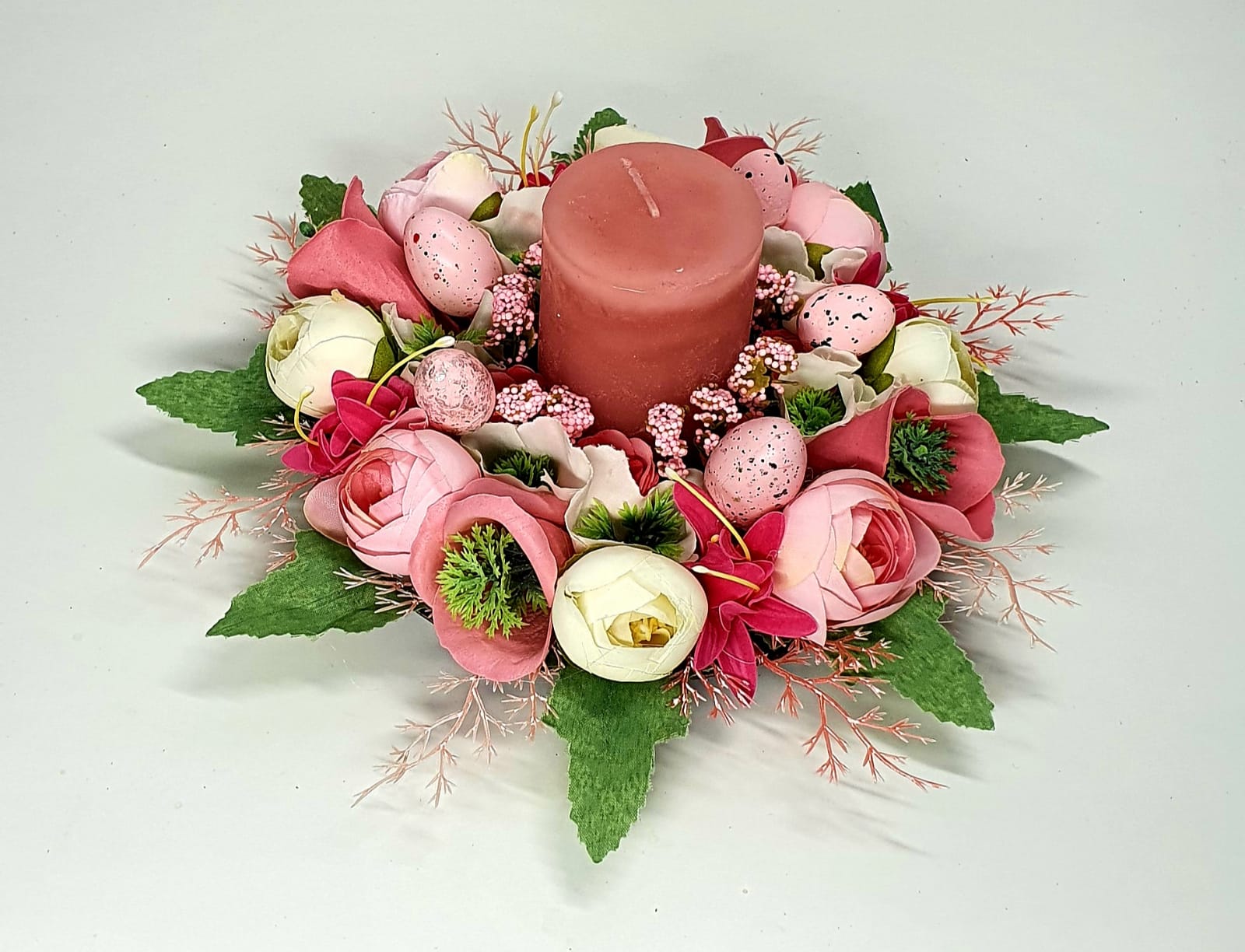 Aranajament realizat in tematica pascala cu flori de matase si plastic pe suport metalic