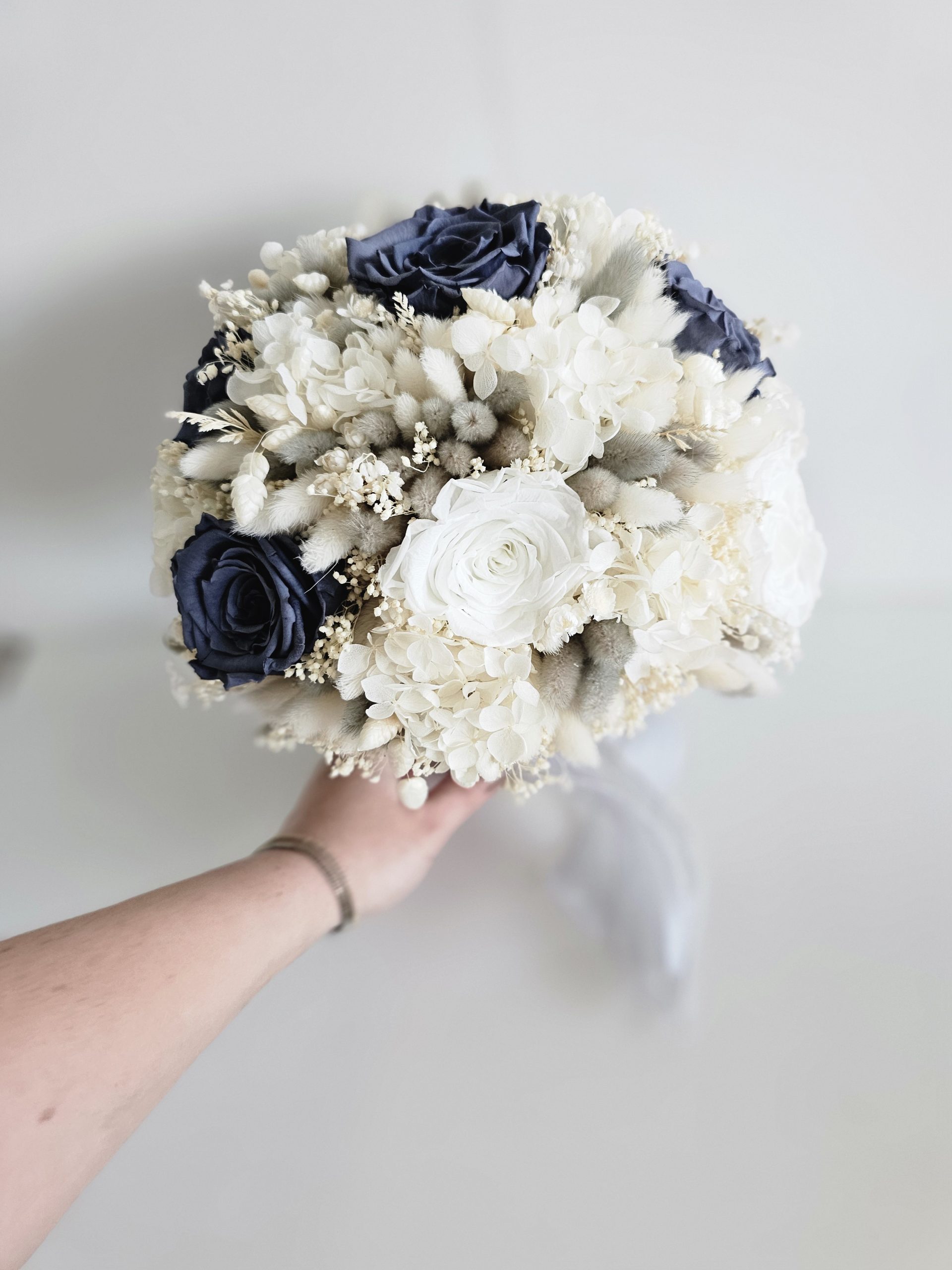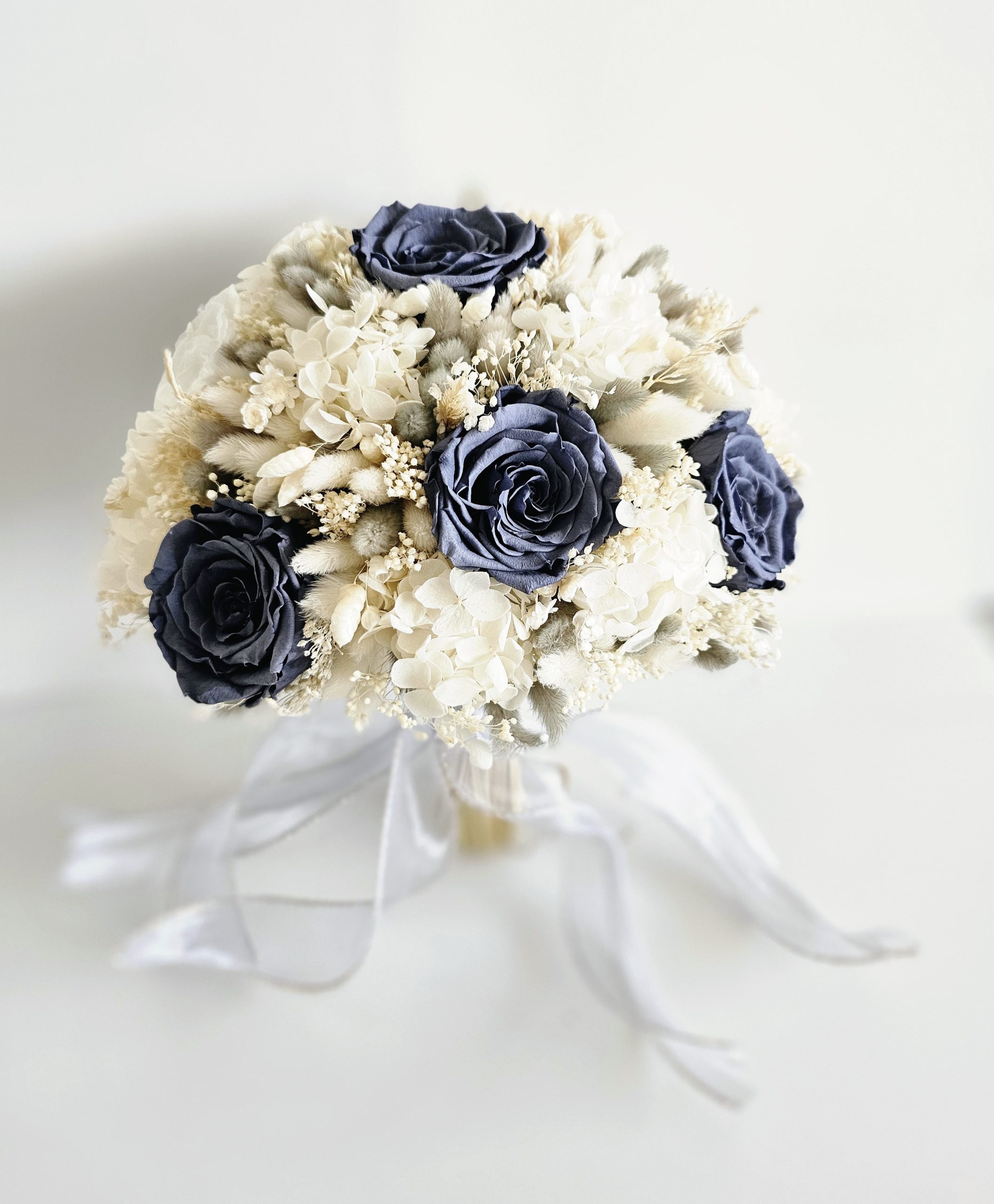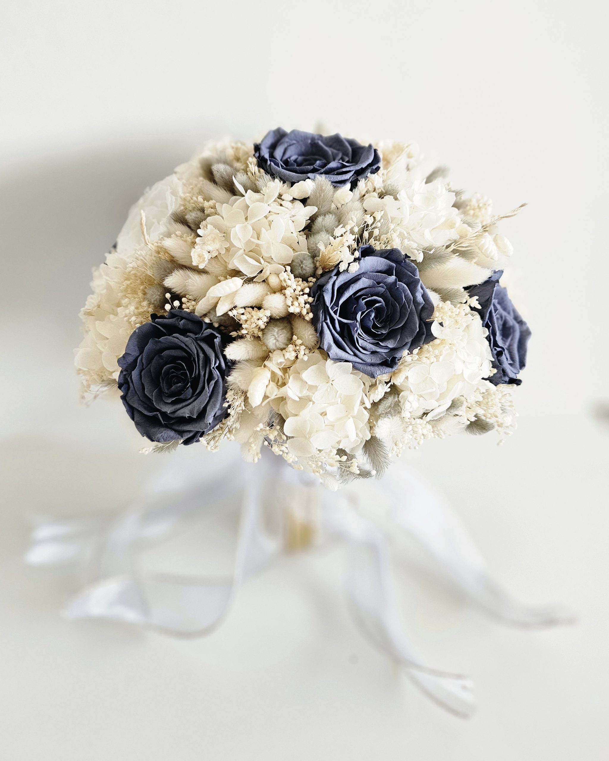 Buchet realizat cu flori criogenate si uscate, ce contine 11 trandafiri criogenati de diferite marimi si hortensie criogenata. Culori predominante gri-antracit, ivoire si alb.