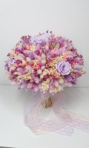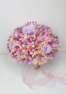 Buchet realizat din flori uscate si criogenate ce contine 5 trandafiri si floarea-miresei criogenata. Culori predominante roz-pal, mov-lila, violet si ivoire.