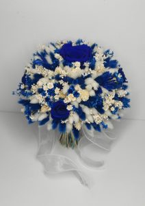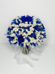 Buchet realizat cu flori uscate si criogenate ce contine 5 trandafiri criogenati. Culori predominante albastru-royal si ivoire.