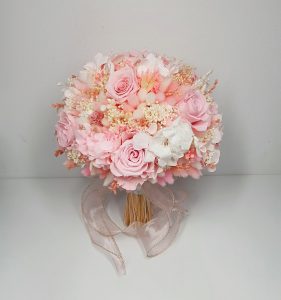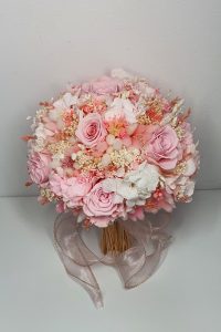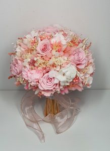 Buchet realizat din flori uscate si criogenate ce contine 7 trandafiri criogenati si hortensie criogenata. Culori predominante roz pal, alb si ivoire.