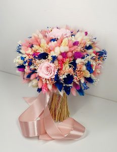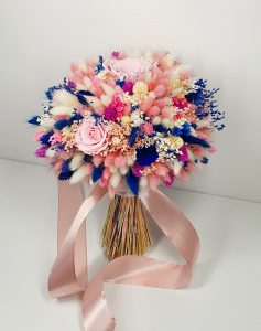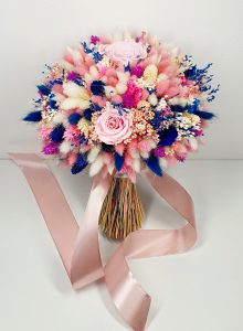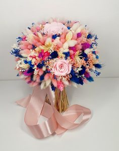 Buchet realizat din flori uscate si criogenate ce contine 5 trandafiri criogenati de diferite marimi. Culori predominante roz pal, albastru royal si ivoire