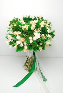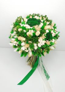 Buchet realizat dn flori uscate si criogenate ce contine cinci trandafiri de diferite dimensiuni. Culori predominante verde-siberian si ivoire.