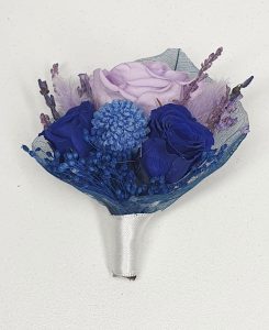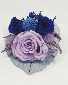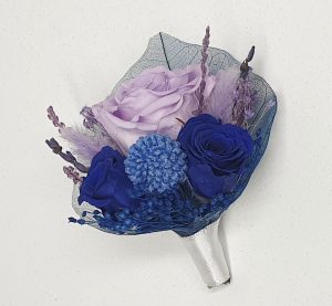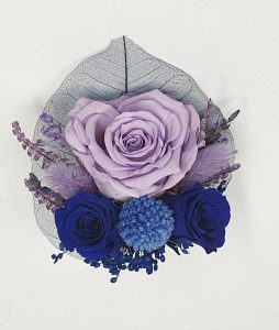 Cocarda mediu plus realizata cu flori uscate si criogenate, ce contine trei trandafiri criogenati de diferite marimi, feriga criogenata si craspedia criogenata. Culori predominante albastru-royal, mov-lavanda si mov-lila.
