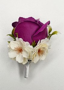 Cocarda realizata din flori de sapun ce contine un trandafir de 5 cm si doua flori de cires. Culori predominante mov-pruna si alb.