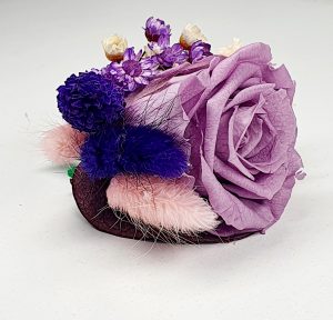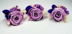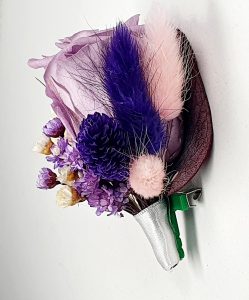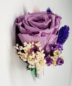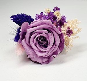 Cocarda realizata din flori uscate si criogenate. Contine un trandafir de 3 cm. Culoare indigo si lila.