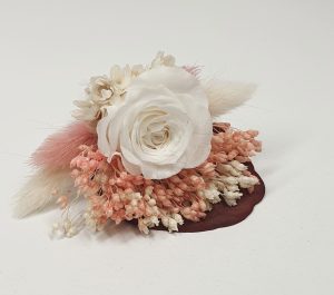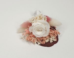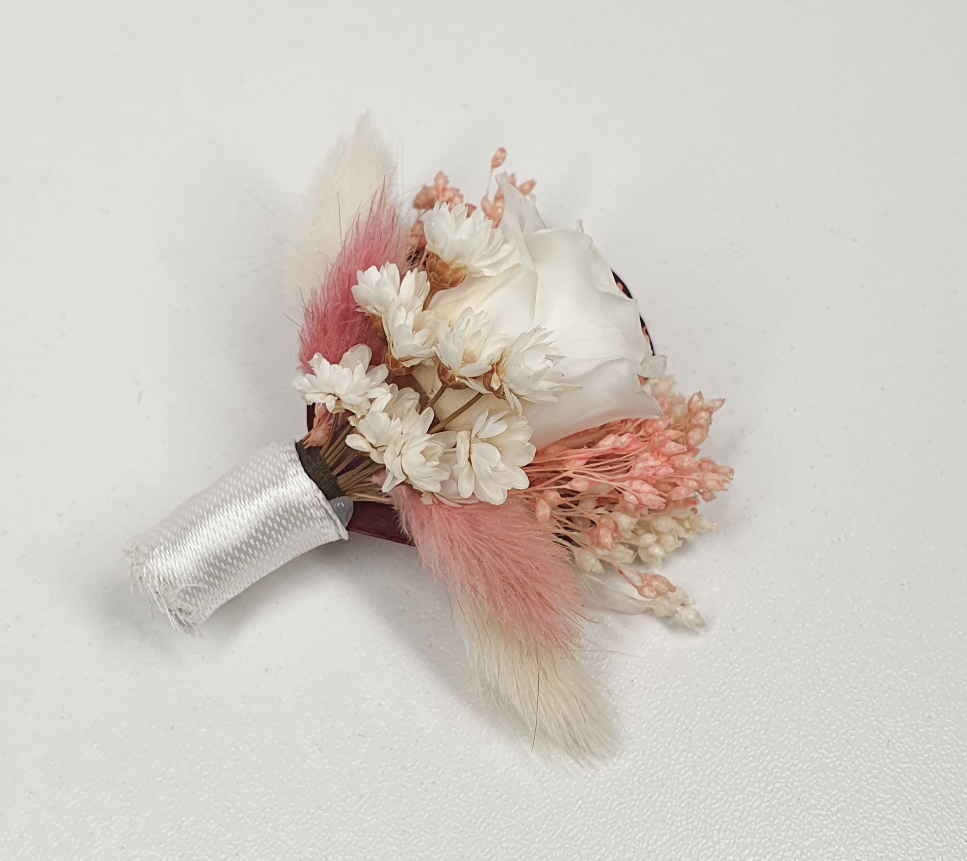 Cocarda realizata din flori uscate si criogenate. Contine un trandafiri de 1 cm. Culori predominate roz si ivoire.