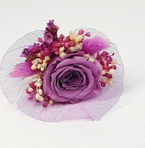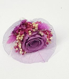 Cocarda mica realizata din flori uscate si criogenate ce contine un trandafir de 1 cm. Culori predominante violet, mov si ivoire.