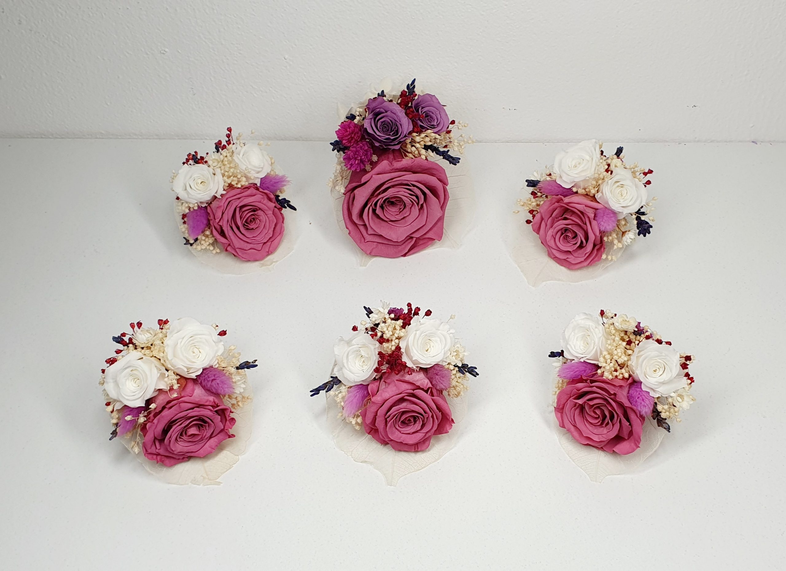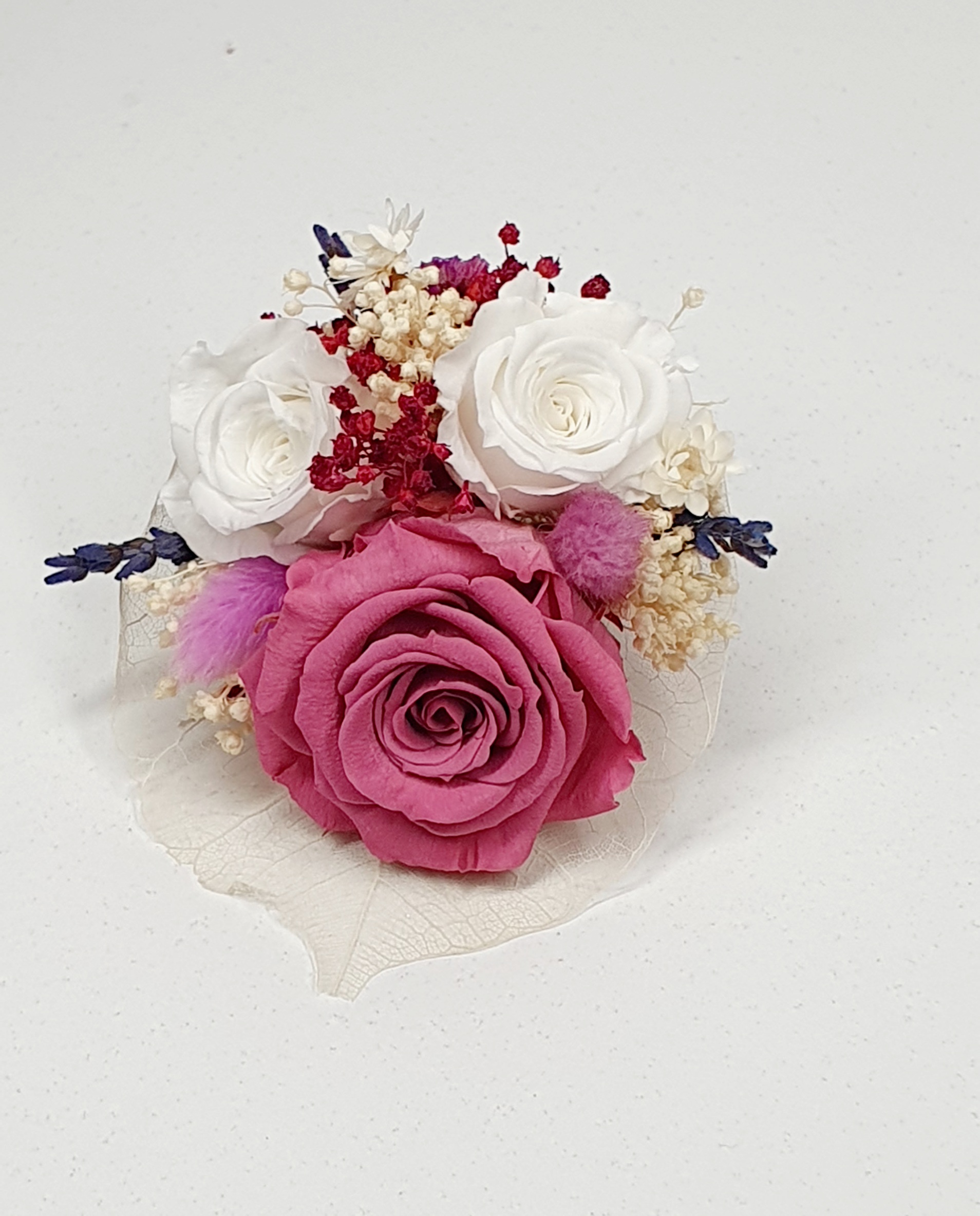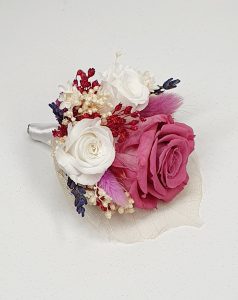 Cocarda mediu plus realizata din flori uscate si criogenate ce contine 3 tradafiri de diferite dimensiuni. Culori predominante roz-spumade vin, mov-lavanda, violet si ivoire.