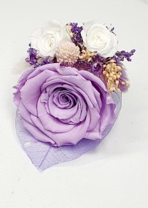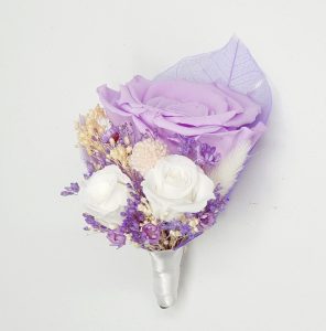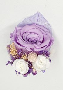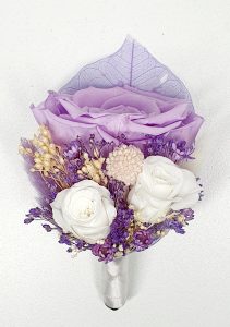Cocarda realizata din flori uscate si criogenate ce contine trei trandafiri de diferite dimensiuni. Culori predominante lila, mov, alb si ivoire.